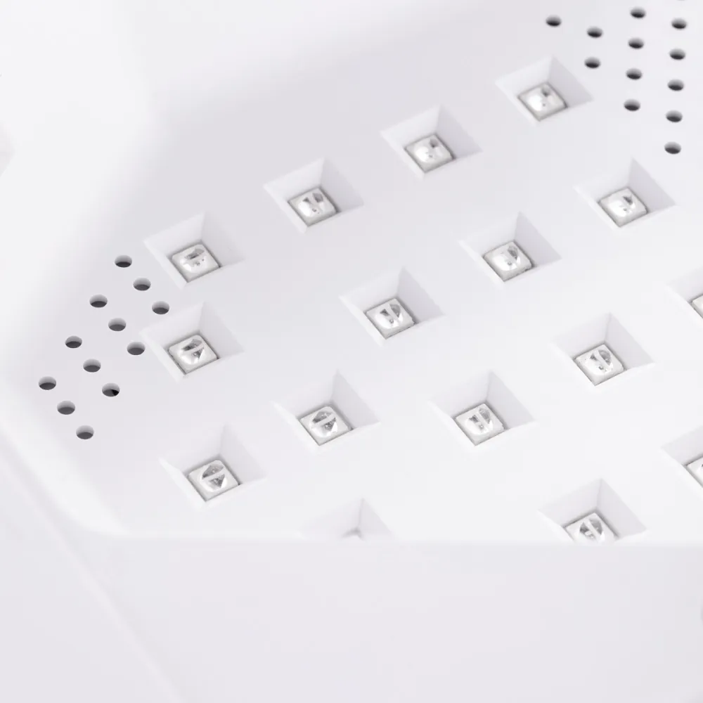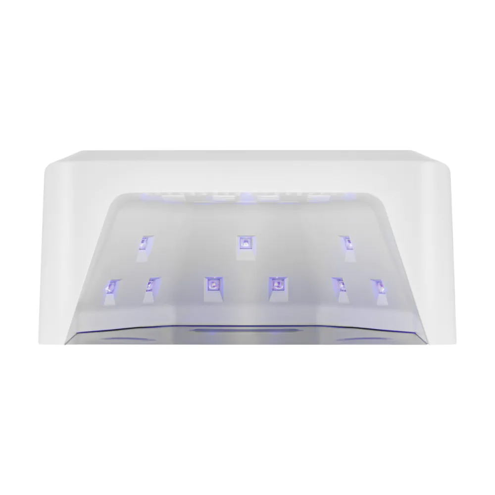 Lampas korpuss ir izgatavots no izturīgas plastmasas un apvieno modernu, minimālistisku dizainu ar praktiskumu. Lampa ir viegli tīrāma, izturīga pret bojājumiem un pietiekami ietilpīga, lai ērti novietotu visu roku vai kāju, nodrošinot ātru un vienmērīgu sacietēšanu. Noņemamā magnētiskā pamatne atvieglo pedikīru, kā arī ierīces tīrīšanu un dezinfekciju, uzlabojot higiēnu un darba komfortu salonā.